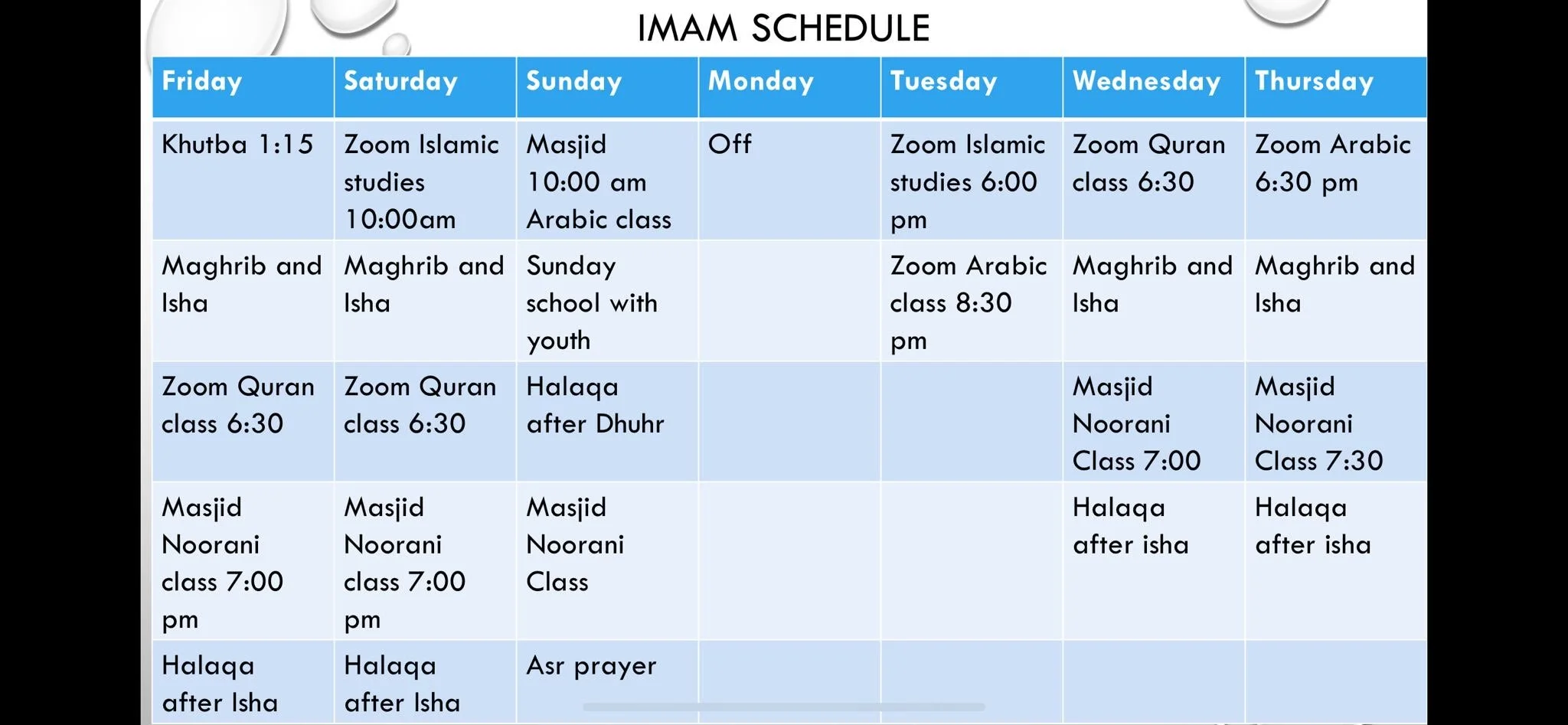 We have daily Maghrib and Isha prayers. Imam Amro provides daily halaqa before Isha from Wednesday-Sunday and Hifz lessons.